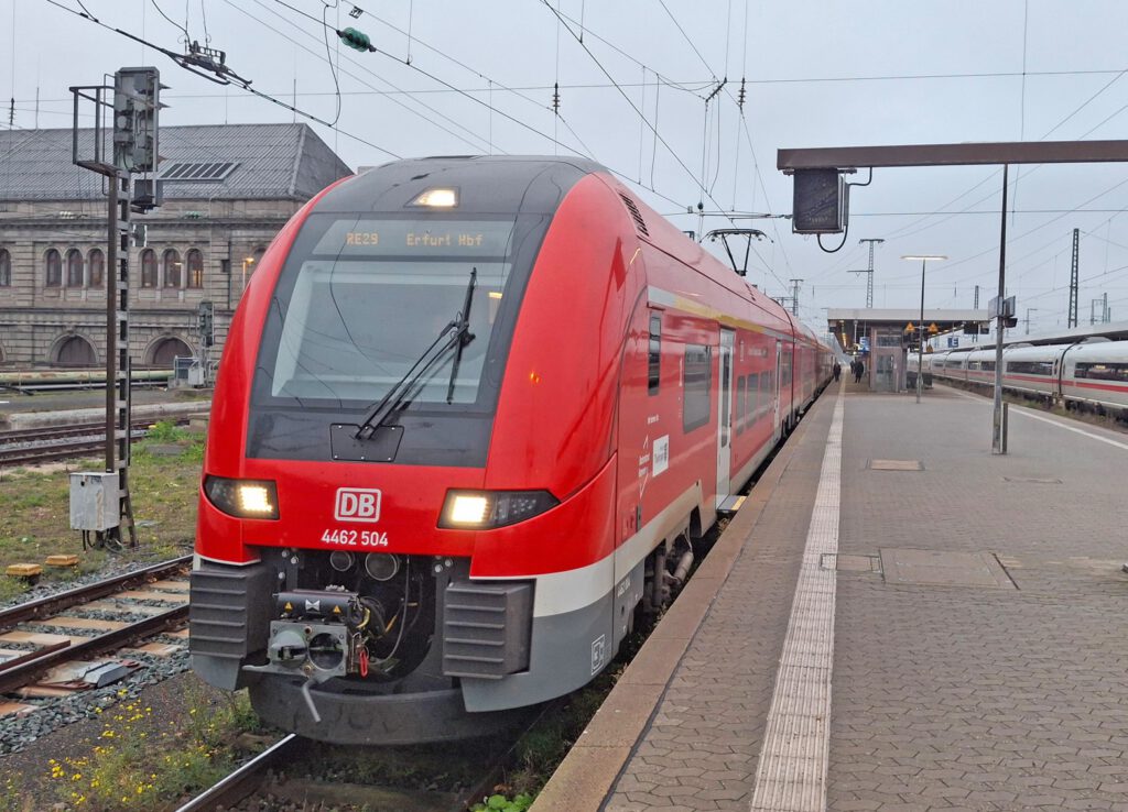Bei herbstlich trübem Novemberwetter starteten wir morgens um 08.10 Uhr in Nürnberg Hbf mit dem Franken-Südthüringen-Express. Seit letztem Jahr gibt es diese als RE 29 bezeichnete, direkte Verbindung von Nürnberg nach Erfurt. Sie wird mit 6-teiligen Desiro HC-Zügen von Siemens Mobility bedient. Da nur sechs Züge mit der Baureihenbezeichnung 4462 für diese Verbindung von DB Regio beschafft wurden, kann nur in der Hauptverkehrszeit am Morgen und am Abend ein 2-Stunden-Takt angeboten werden, tagsüber wird im 4-Stunden-Takt gefahren.