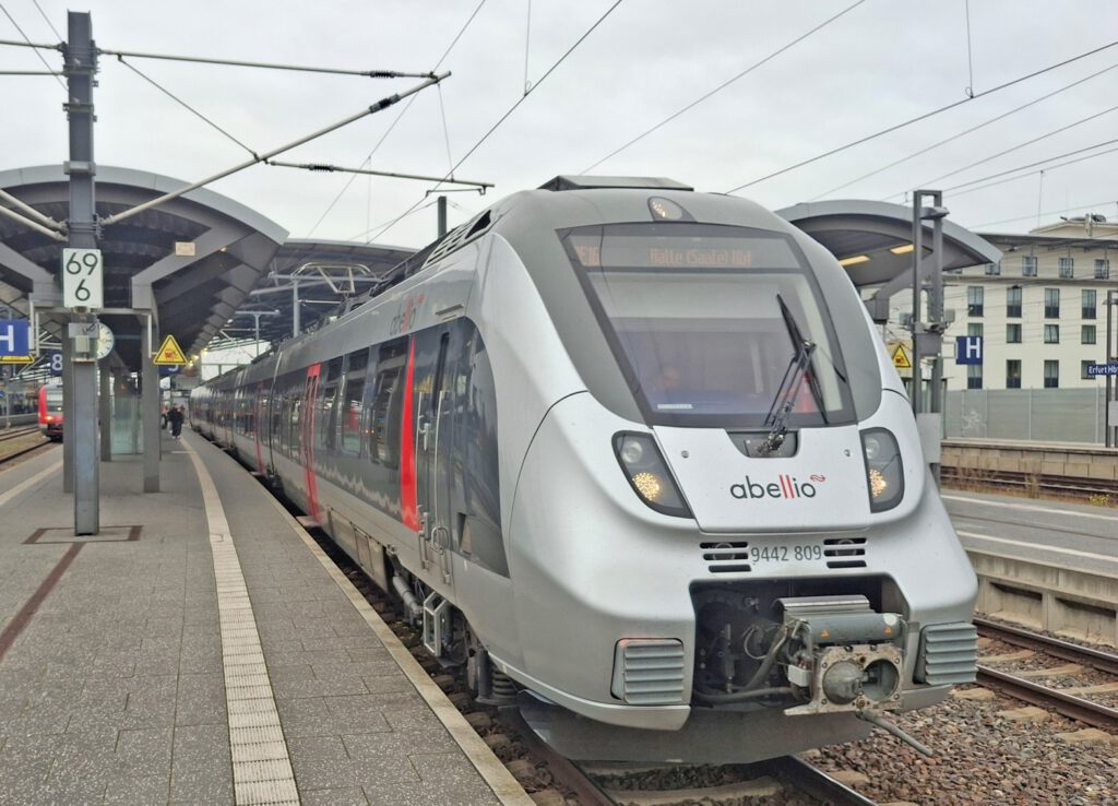 Mit dem 5-teiligen Talent-Triebwagen 1442 309/809 des Betreibers Mitteldeutsche S-Bahn ging es um 10.37 Uhr weiter als RB 16 über Weimar, Naumburg und Weißenfels nach Halle/Saale. Auch in Halle war wiederum rund eine halbe Stunde Aufenthalt, was abermals zur kulinarischen Stärkung genutzt wurde. Sagenhaft günstig waren dort die Preise, die man selbst in der Bahnhofsgastronomie noch erspähen konnte: eine Bockwurst mit Brötchen bei einer Metzgerei in der Bahnhofshalle für nur 2,80 €. Da musste natürlich zugegriffen werden, was mitunter zu längeren Warteschlangen am Verkaufsstand der Metzgerei führte.